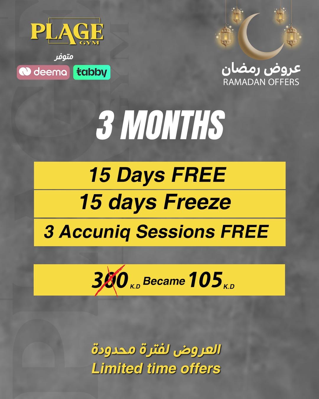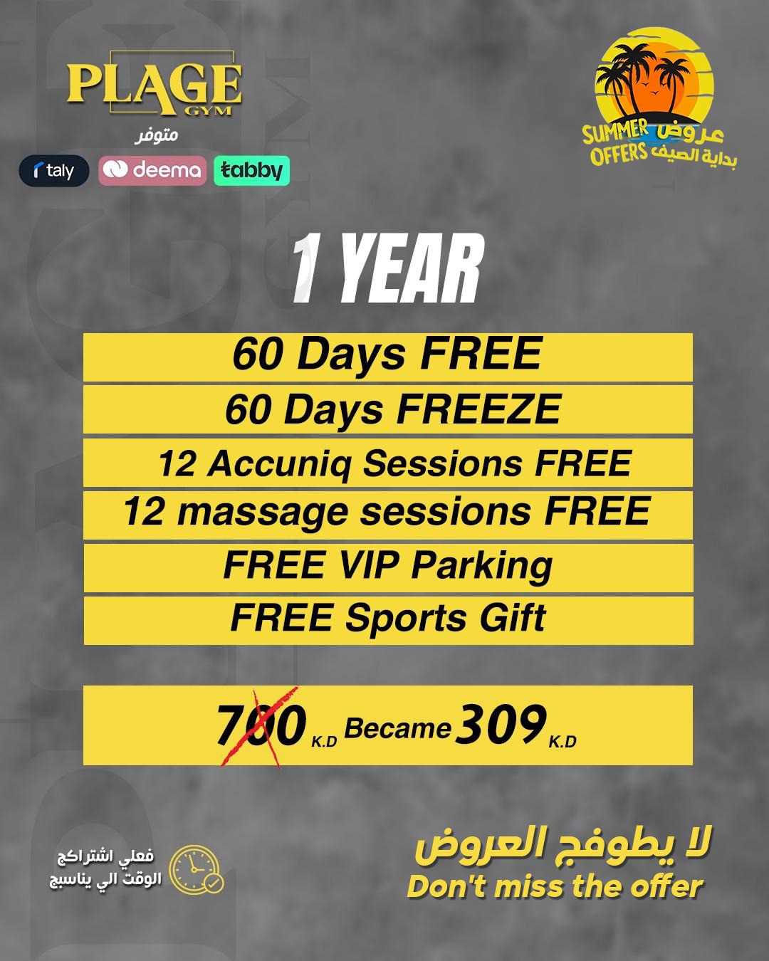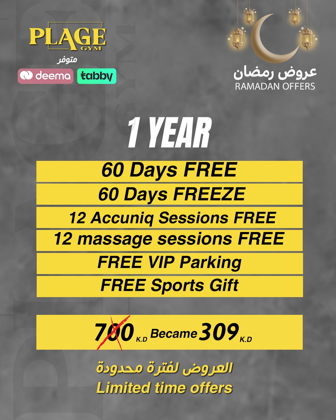 1 year subscription + 60 days free + 60 days freeze + 12 free Accuniq sessions + 12 massage sessions free + Free VIP Parking + Free Sports Gift