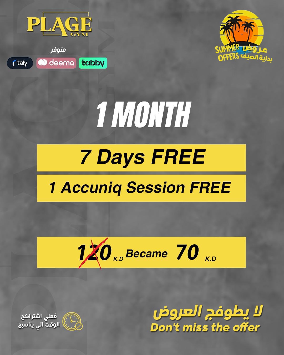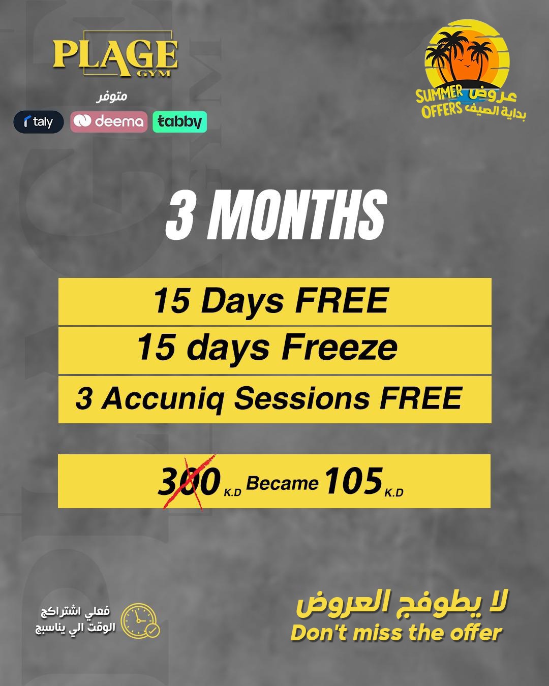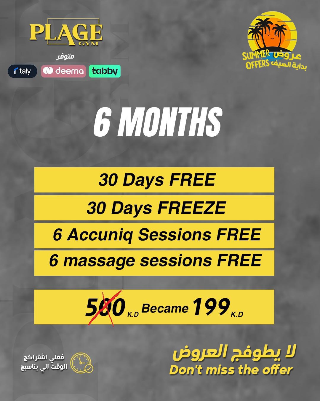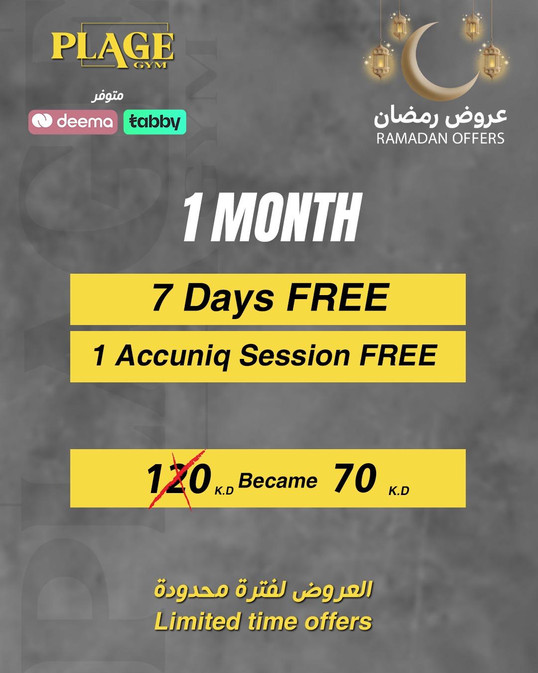 1 year subscription + 60 days free + 60 days freeze + 12 free Accuniq sessions + 12 massage sessions free + Free VIP Parking + Free Sports Gift