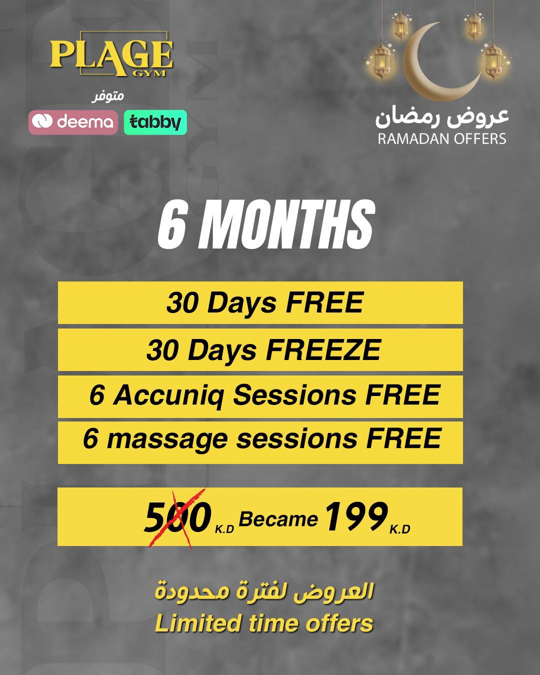 6 months subscription + 30 days free + 1 month freeze + 6 massage sessions free + 6 Accuniq sessions free