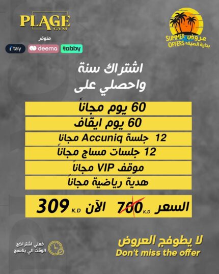اشتراك سنة + شهرين مجانا + شهرين ايقاف + 12 جلسات مساج مجانا + 12 جلسات Accuniq مجانا + موقف VIP مجانا + هدية رياضية مجانا